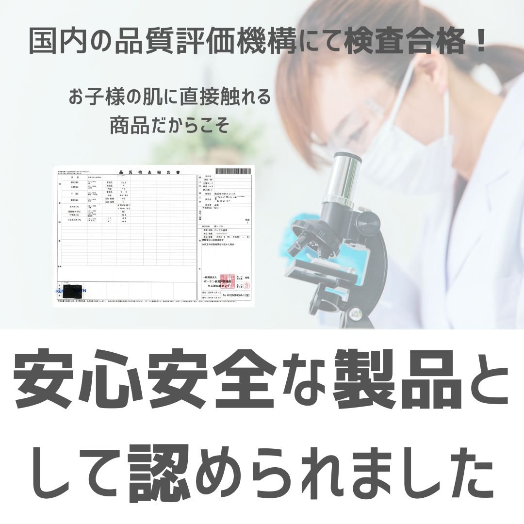一般財団法人ボーケン品質評価機構にて2025年8月発行の試験報告書から、耐光・洗濯・汗・摩擦・破裂強さ・寸法変化率の6項目試験での合格。